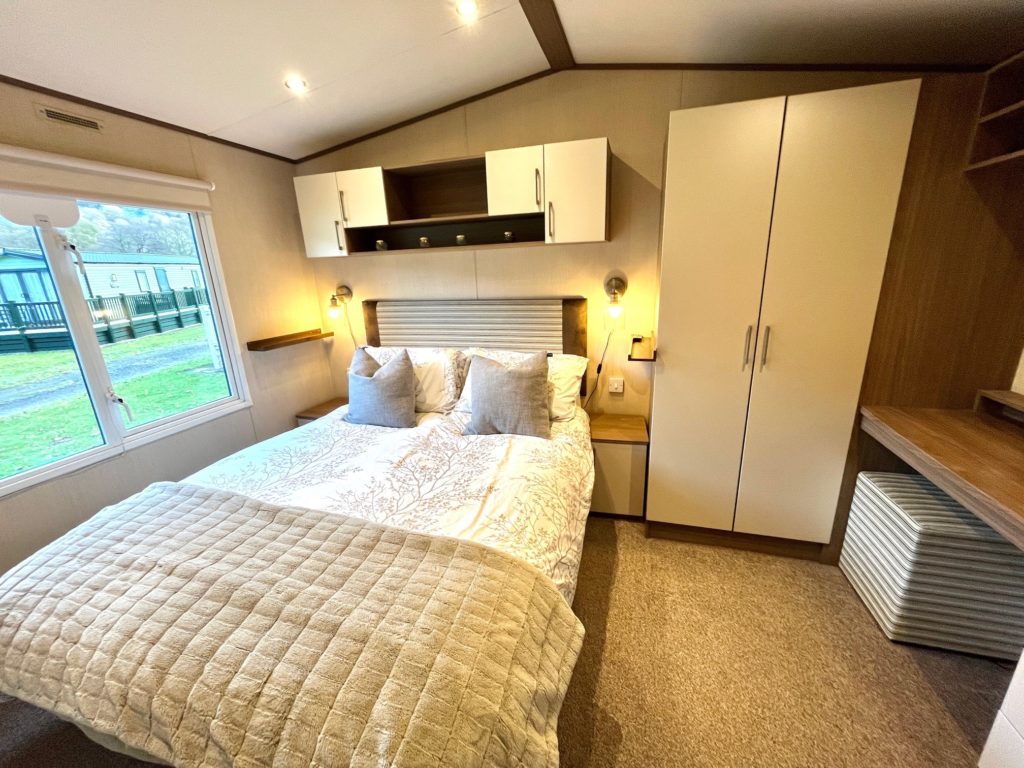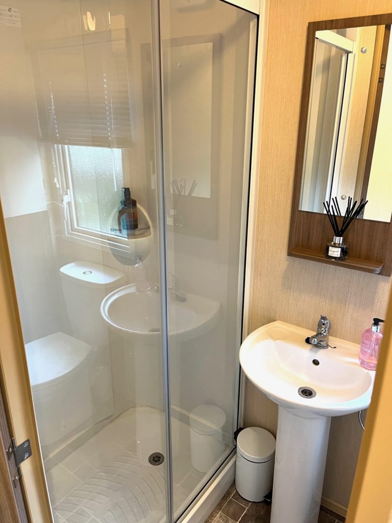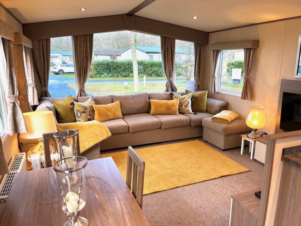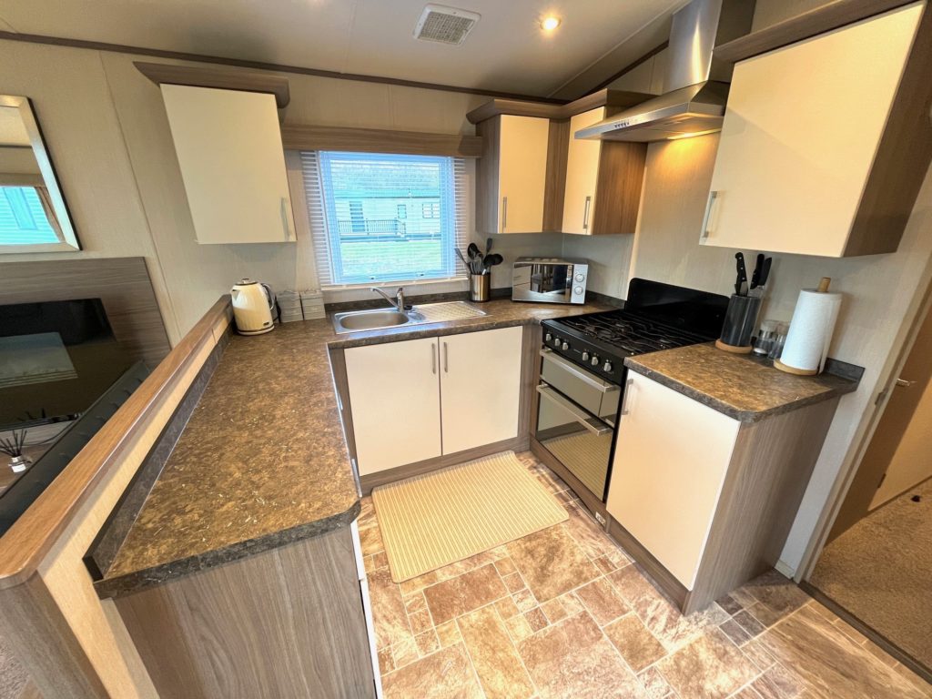 The kitchen has built in appliances including a cooker, microwave and fridge. The open-plan lounge / dining area has a spacious corner sofa and electric fire to keep you cosy during the winter months. We love the neutral decor throughout the kitchen and living area with a dining table for family entertaining.